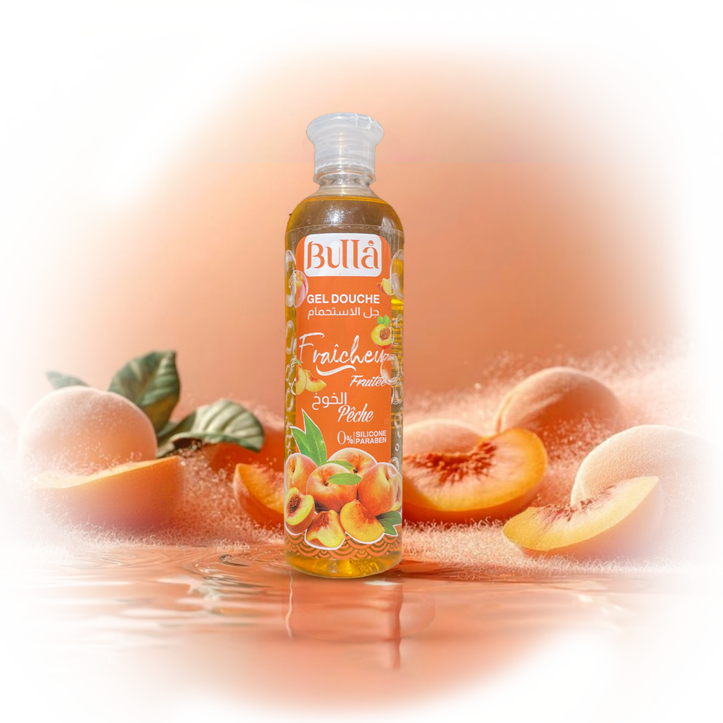 Découvrez le Gel Douche de Bulla, rafraichissant à la Pêche, avec sa texture agréable, bon pour la peau, une formule sans parabène et sans silicone.